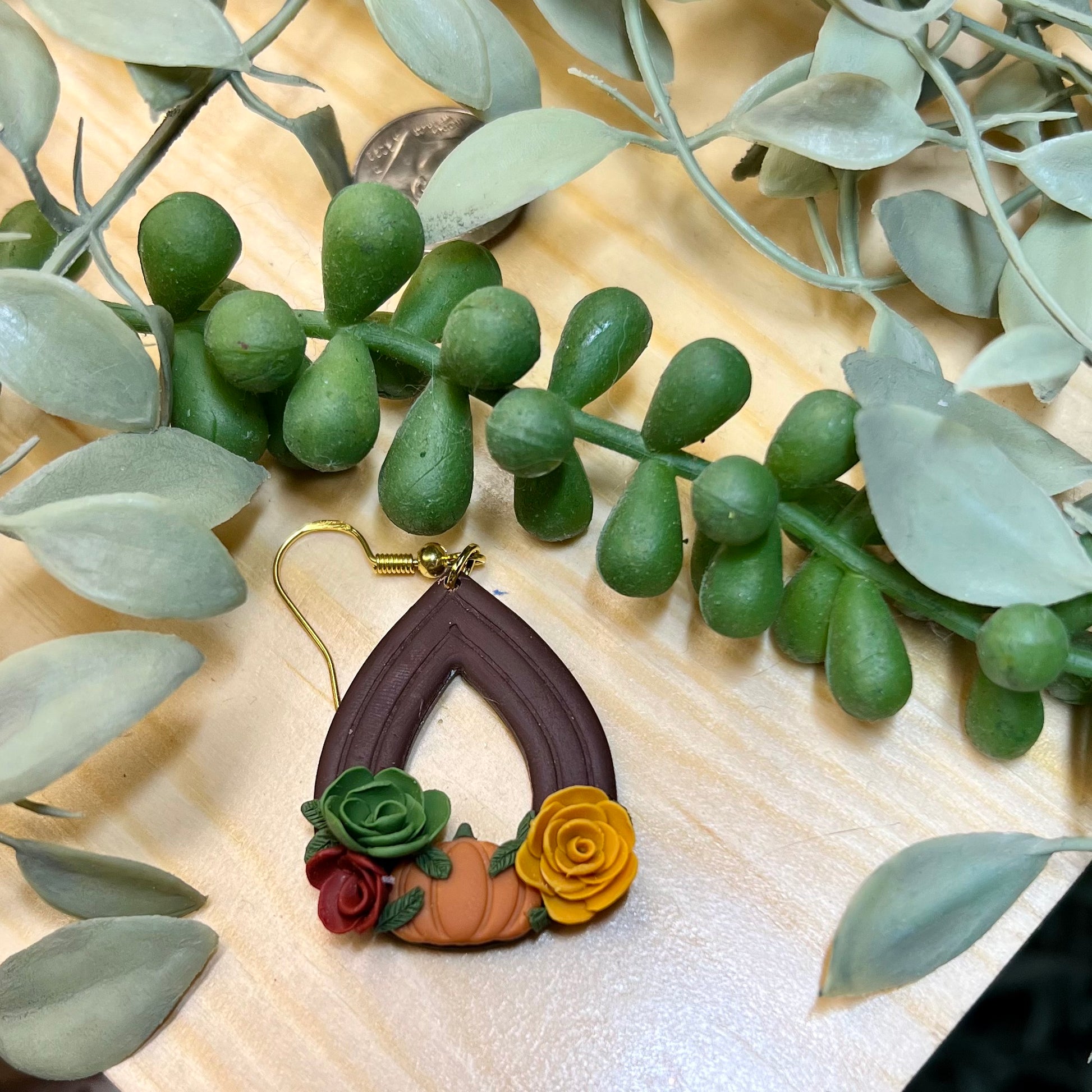 Make a bold statement this fall with exquisite Fall Teardrop Earrings! These intricately detailed earrings feature red, green and yellow flowers, along with a perfect pumpkin, all handcrafted from lightweight polymer clay. Lead and nickel-free, they're perfect for sensitive ears. An eye-catching and unique accessory for any autumn outfit!