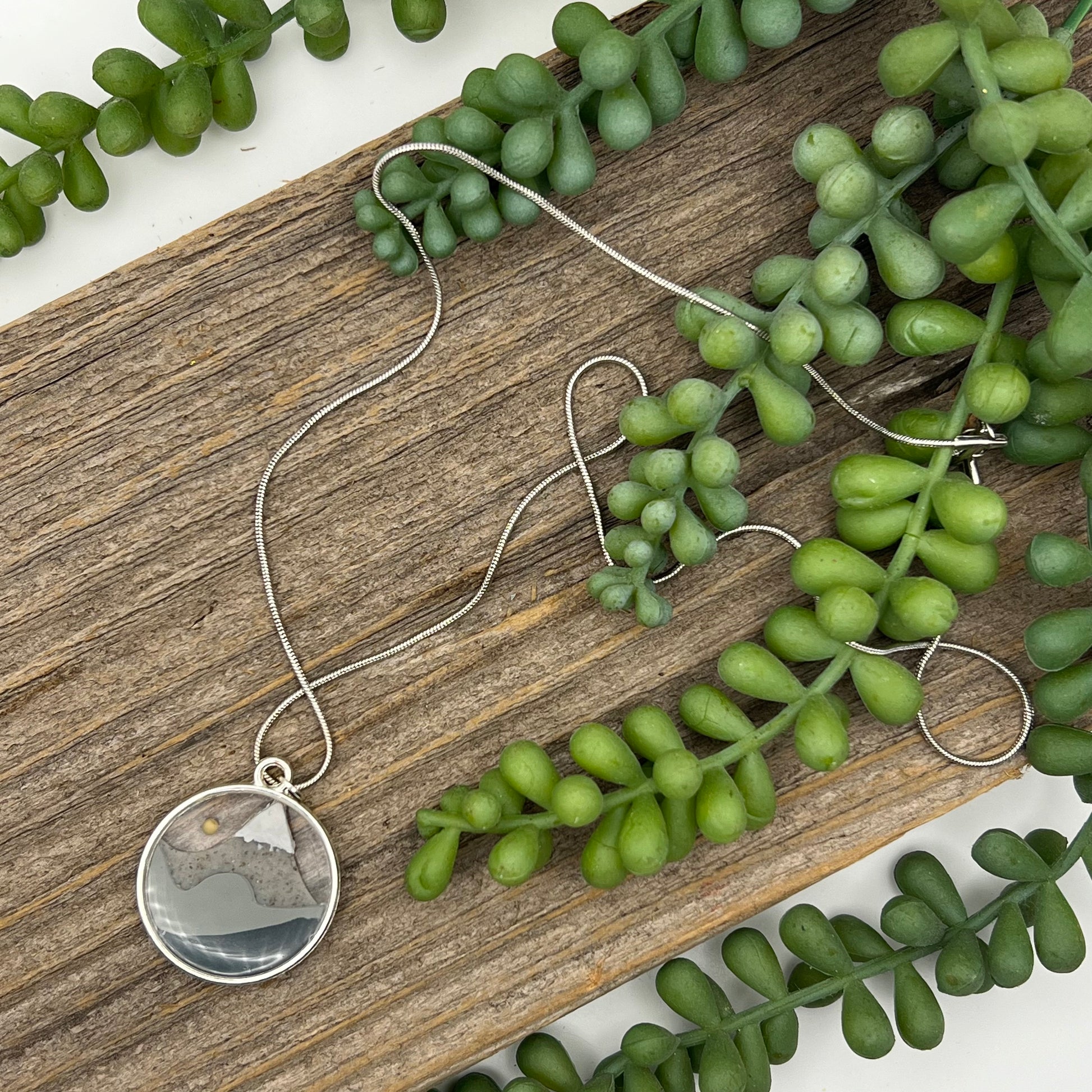 This handcrafted piece combines polymer clay mountains with a mustard seed set in resin. Let this unique piece serve as a hopeful reminder that with faith, you can move mountains.