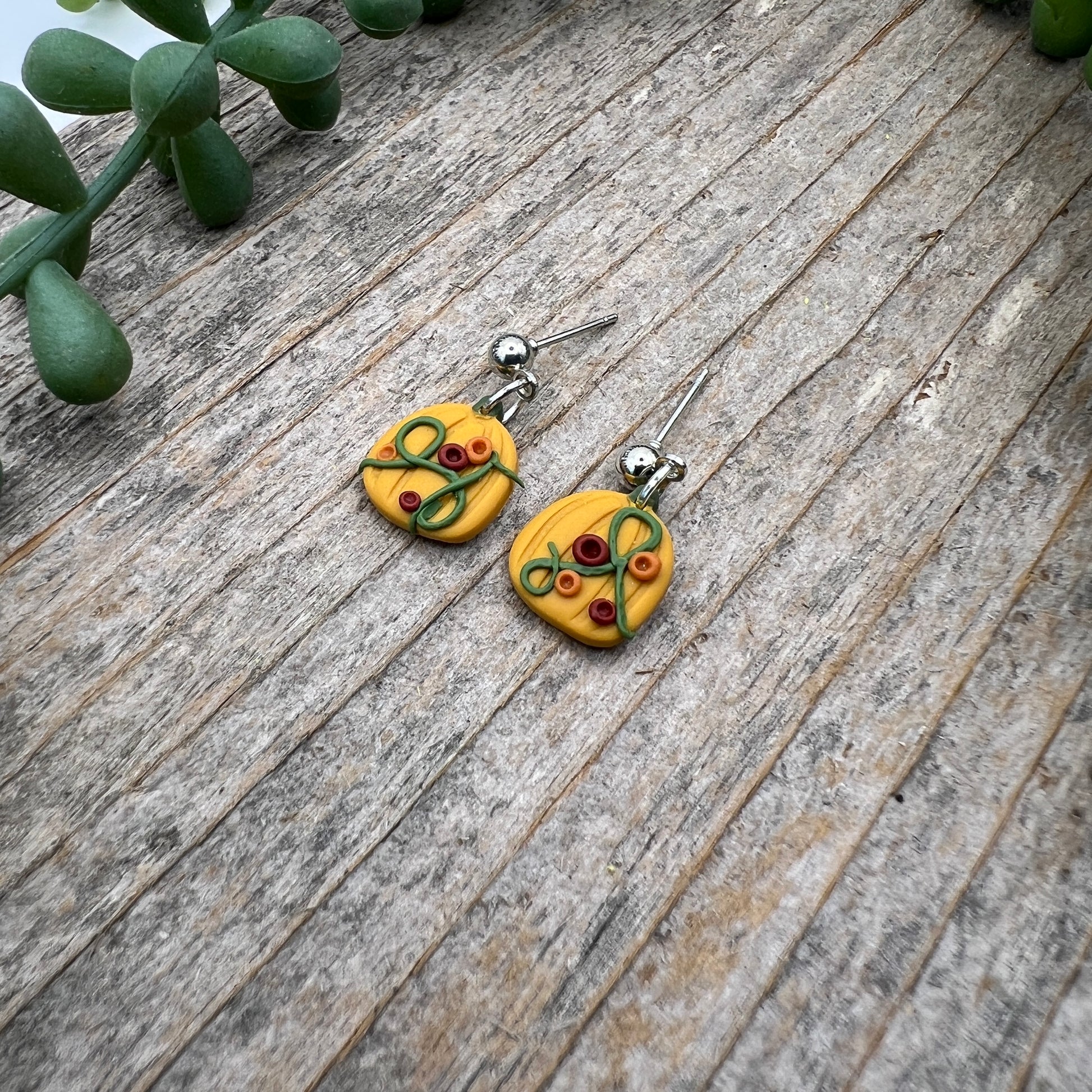 Introducing the ultimate Fall accessory—Pumpkins on the Vine Earrings! Express your love of the season in style, with these delicately-crafted, colorful delights. Each piece is lovingly handmade, so you can bet they're lighter than pumpkin pie! Lead and nickel free, they're sure to be the talk of the patch. Get 'em while they last!