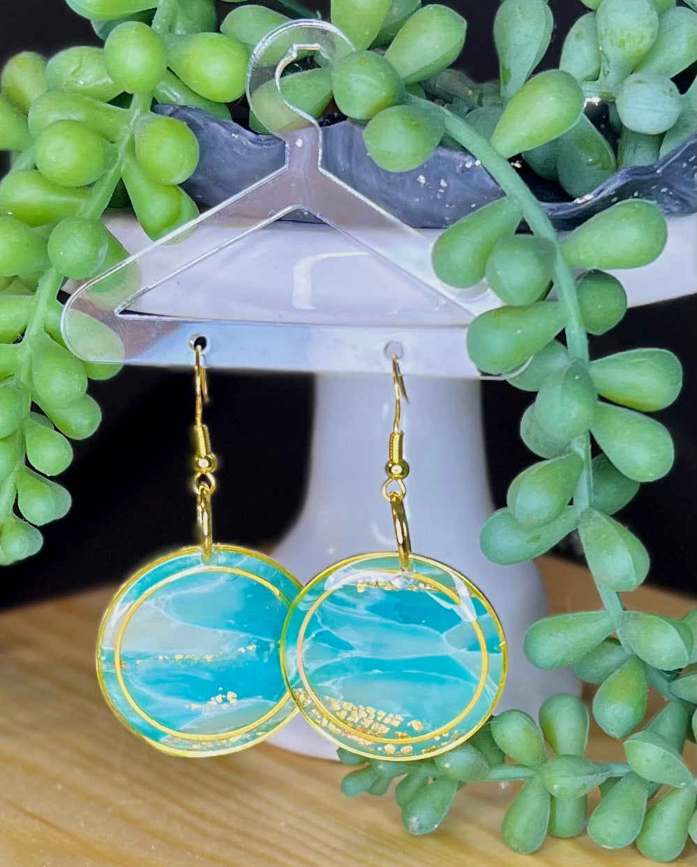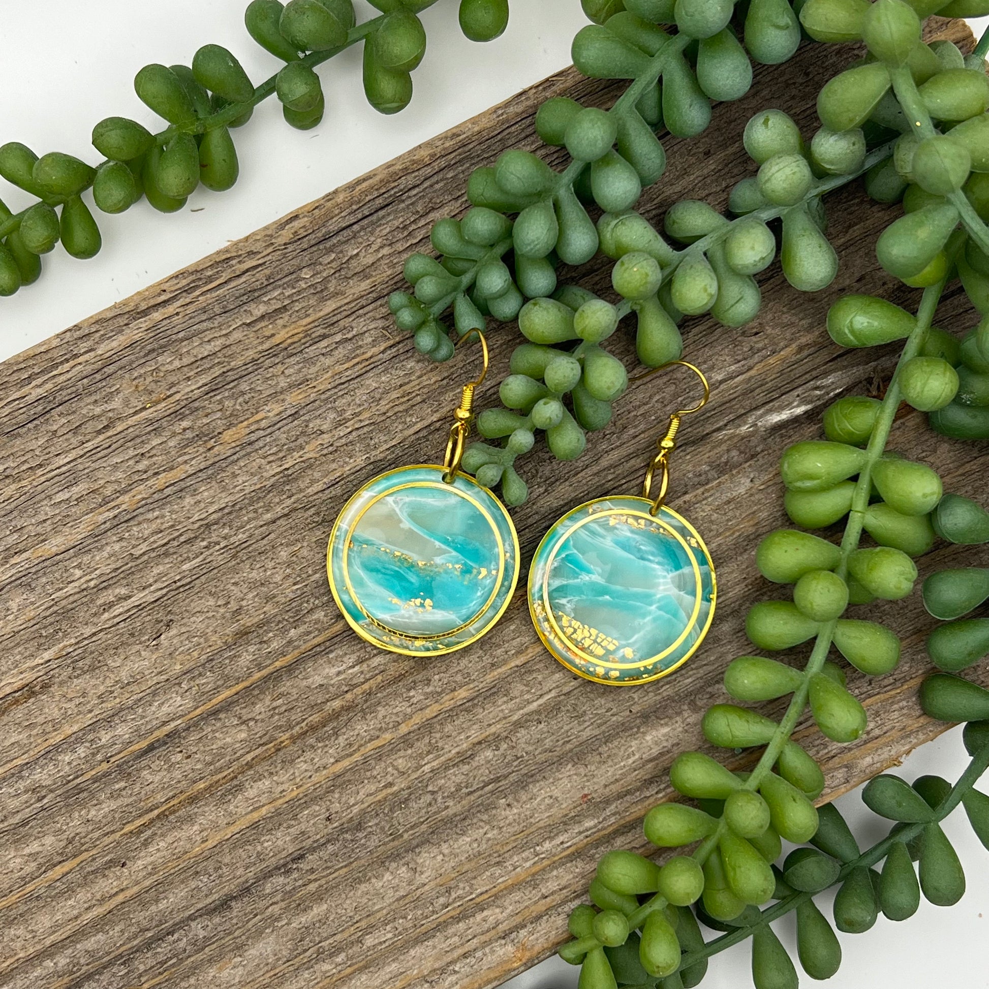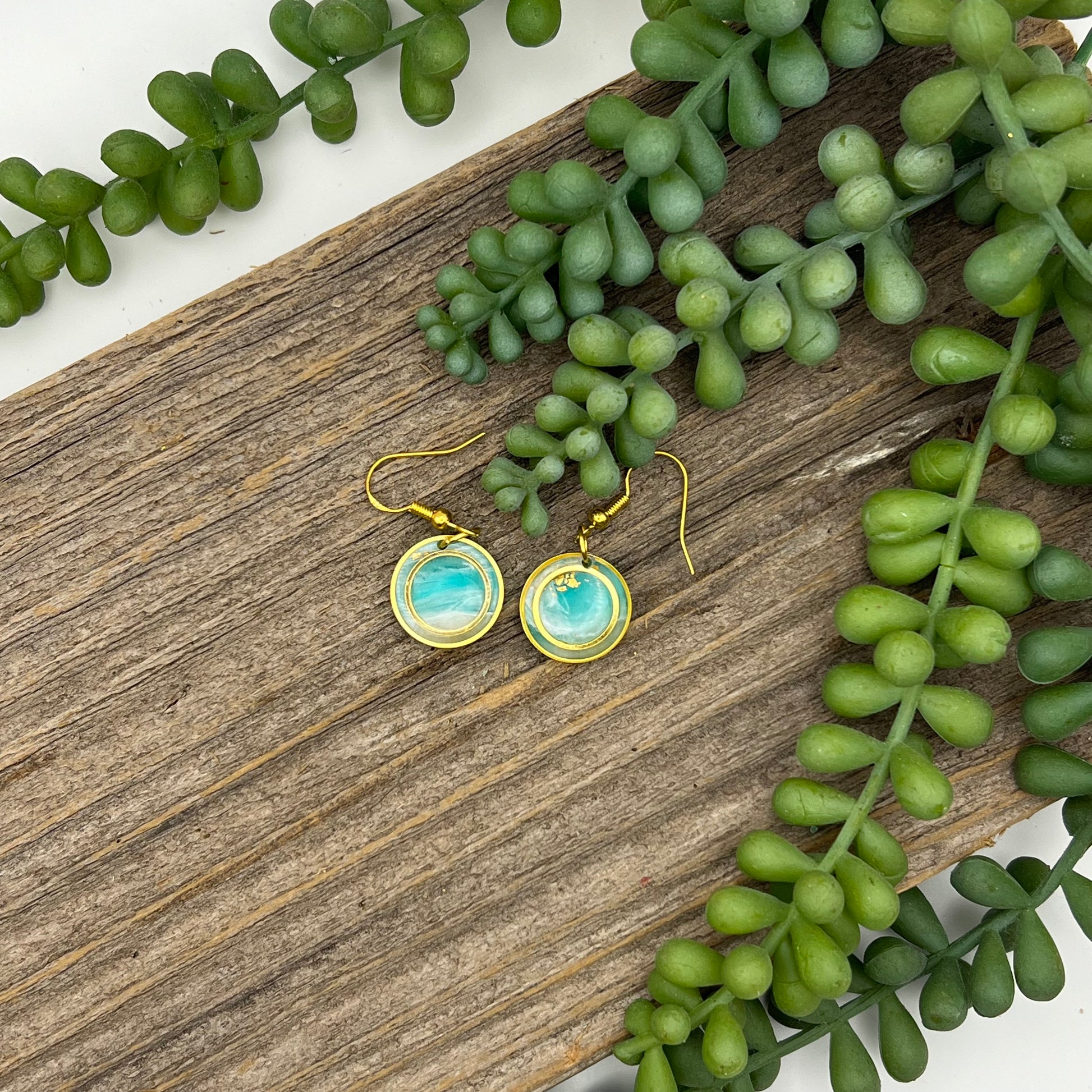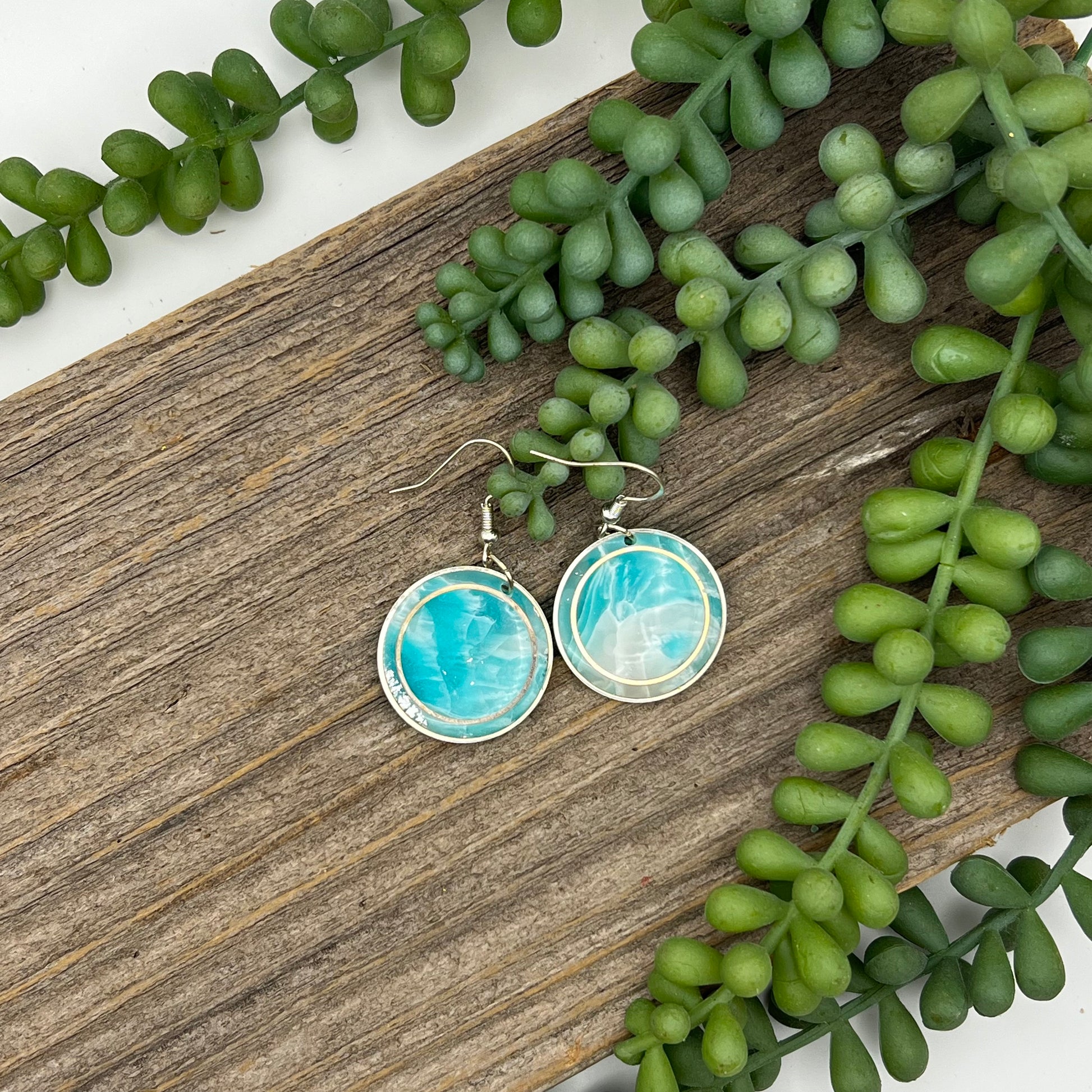Treat yourself to a turquoise daydream! Our Caribbean circle dangle earrings are lightweight and comfortable, yet sparkle with stunning ocean color. Crafted from polymer clay, hypoallergenic, and nickel free metals - you won't be able to resist their Caribbean charm!
